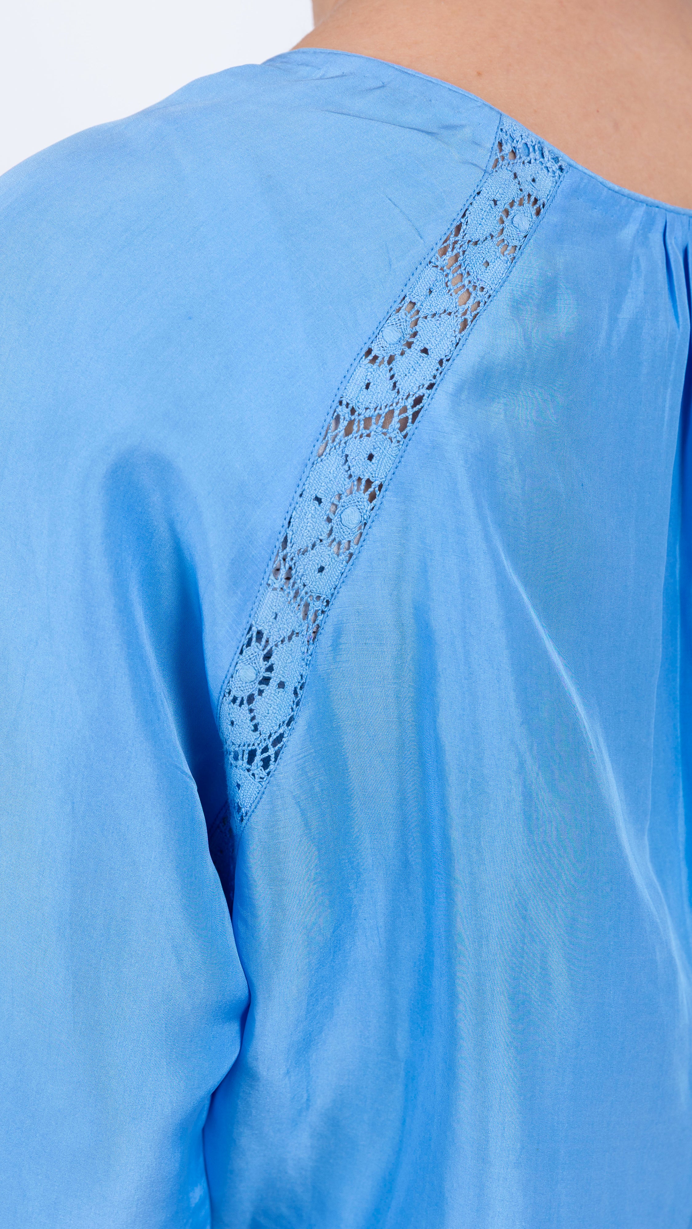 A delicate dainty silk top that oozes fairy tale moods. It's crafted from a gorgeous silk and features raglan sleeves panelled with intricate crochet lace at the shoulder and sleeve seams. The neckline is lightly ruffled to create a flowy top that can be worn with ease. The pleated sleeves add a stylish detail. Pair with jeans or tuck into wide-leg trousersfor an elegant take on sartorial separates.