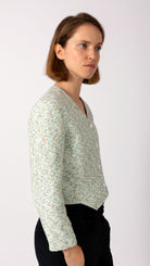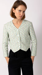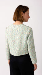 Crafted from a breathable cotton blend, the Fara jacket features a subtly structured silhouette with an interesting high-low waist detail and clean, straight sleeves designed for easy all-day wear. The soft mint-hued weave creates fresh, contemporary appeal while maintaining timeless elegance.