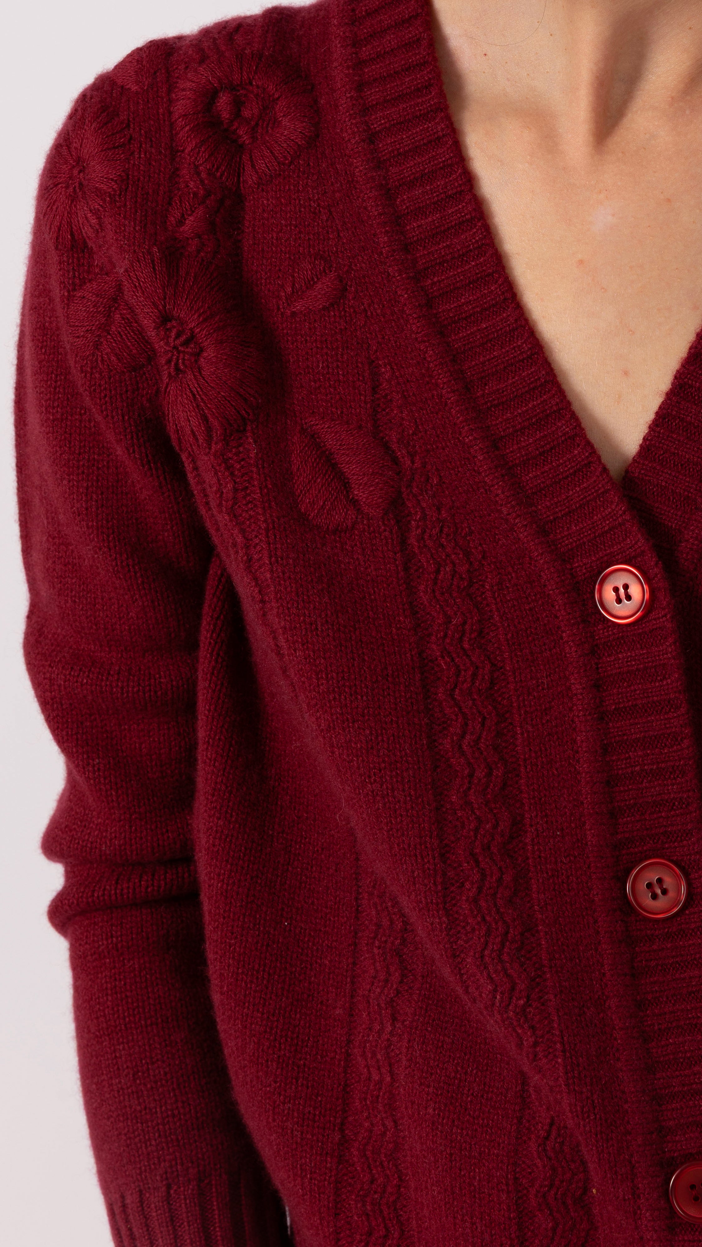 A delicately embroidered floral motif graces the shoulder, adding an artisanal touch that elevates its timeless appeal. Designed for a relaxed fit, this cardigan effortlessly enhances any outfit with its perfect balance of comfort and sophistication.