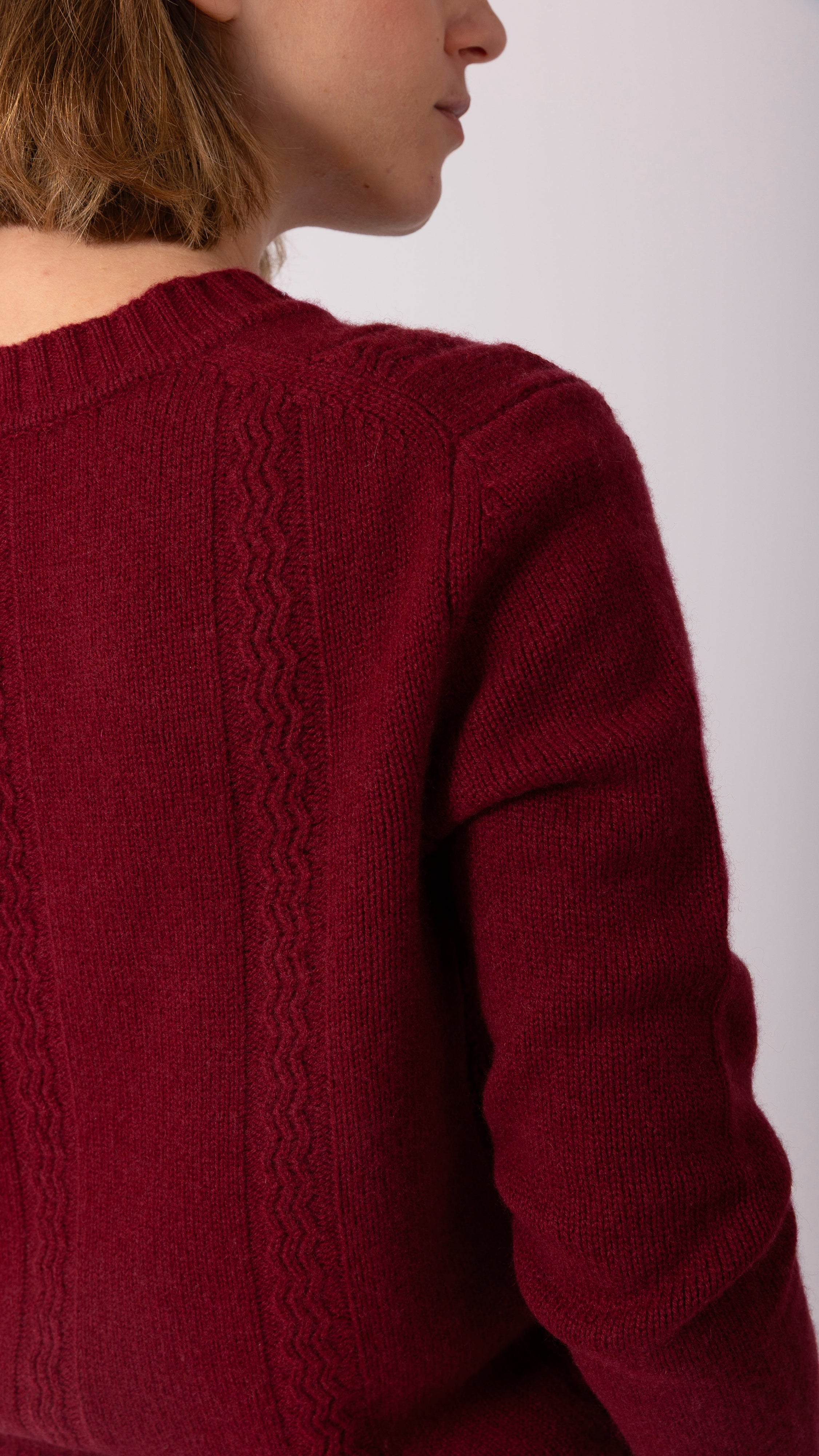 This luxurious cashmere blend cardigan is the ultimate layering piece for cooler days. Crafted from the softest yarn, it features elegant vertical wavy cable knit stripes, finished with a refined ribbed trim along the placket and sleeve cuffs.
