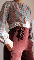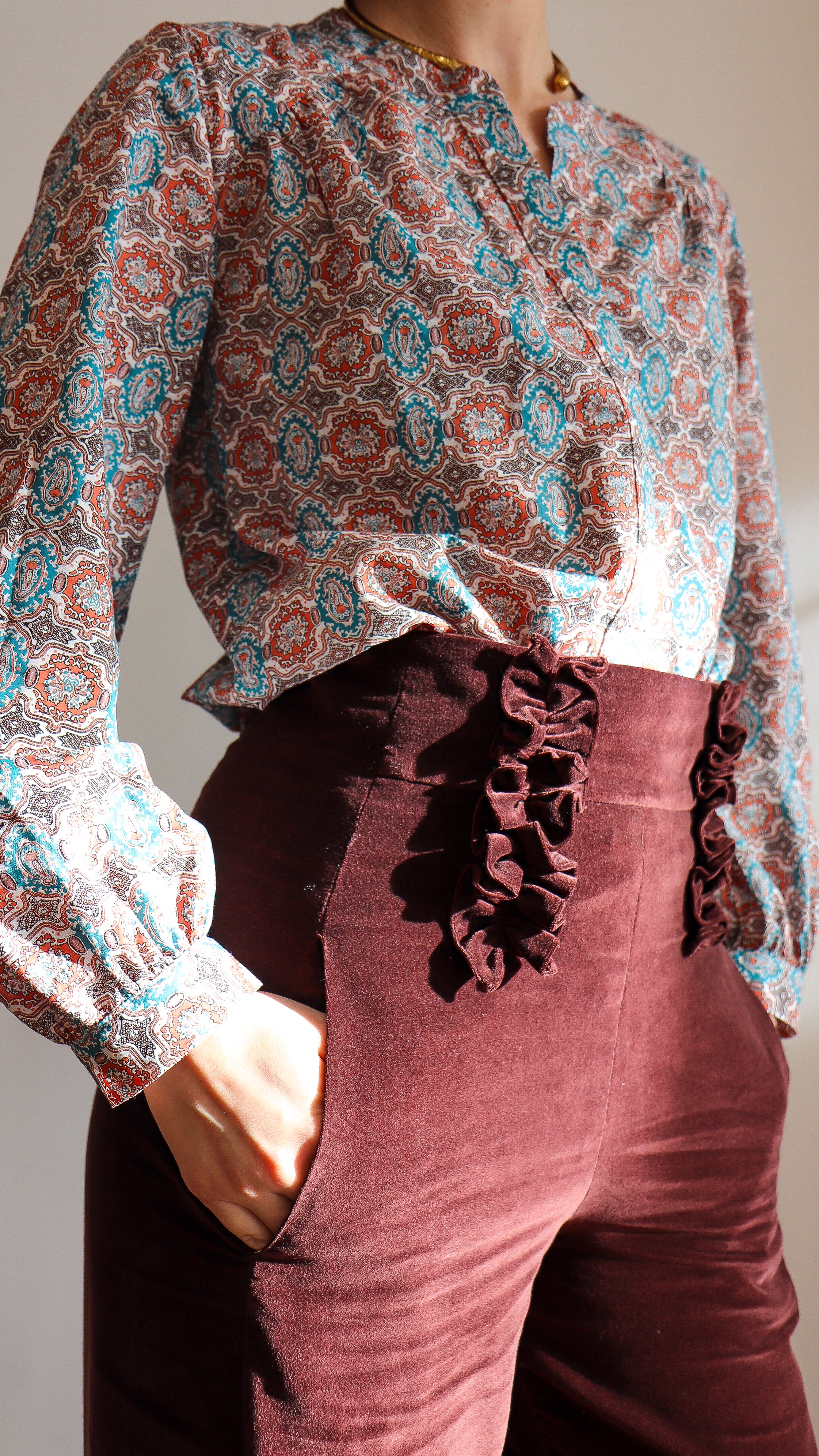 Our signatur Camille ruffle trousers now in a stunning brown velvet - a testament to refined craftsmanship and timeless elegance. These luxurious trousers combine the sumptuous texture of cotton velvet with impeccable tailoring for a sophisticated silhouette that commands attention.