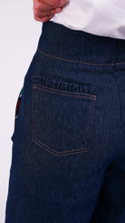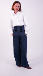 The forever tailored denim trouser that will be the staple item in your capsule collection all year round. These trousers have a flattering silhouette with a high waistband that gently tapers and falls to wide legs. Front ruffles add a decorative contrast stitch detail, as well as contrast pockets for practicality. The ultimate attention to detail has gone into creating beautiful back pockets with VAAI signature ruffles. Crafted with recycled stretch cotton for comfort. Wear with a sweatshirt and sneakers for a casual look, a blazer and cowboy boots for an elevated daytime look, or add glamour by pairing with a silk shirt and heels. Either way, it makes for an elegant all-day-to-night edit.