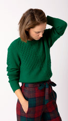 This luxurious wool jumper is the ultimate layering piece for cooler days. Crafted from the softest yarn, it features textured quadrants and intricate cable stitch detailing along the front and sleeves—adding an artisanal touch that elevates its timeless appeal.