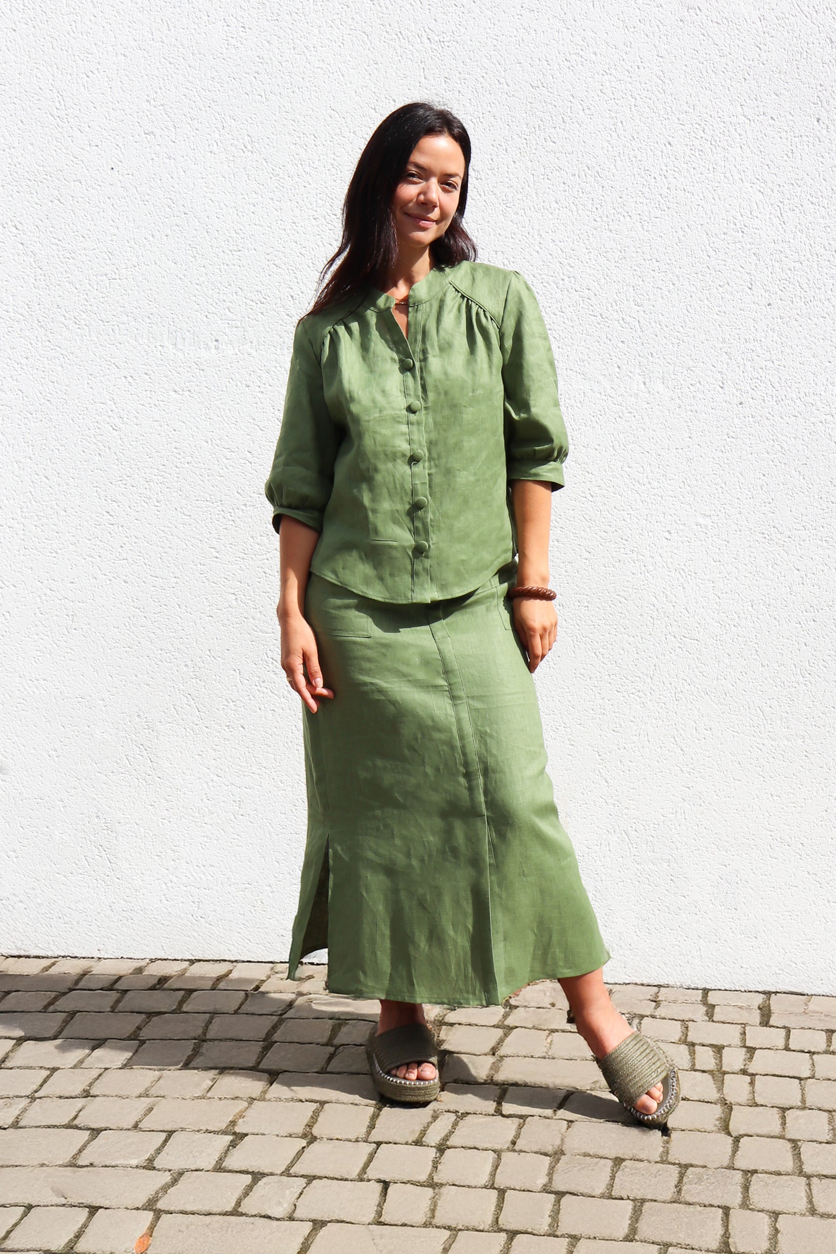 This high-waisted midi skirt is cut from a luxurious and breathable khaki linen. Designed to flatter, it features a sleek silhouette with front and side slits for ease of movement and a subtle hint of skin. Functional patch pockets and elegant self-covered buttons add both utility and charm.